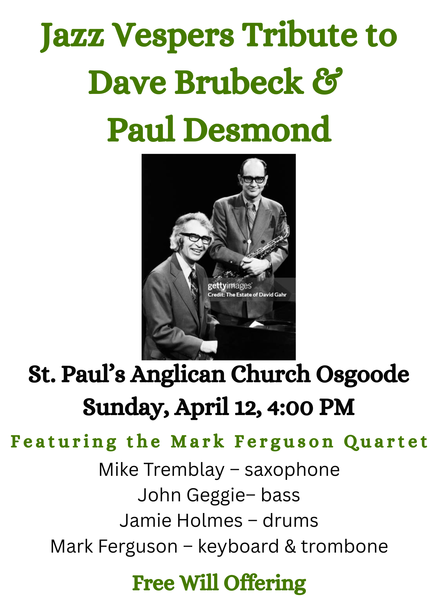 Sunday, April 12, 4:00 PM – Jazz Vespers Tribute to Dave Brubeck & Paul Desmond